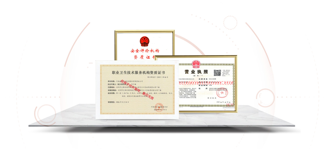 職業衛生檢測、評價資質證書證書編號:(豫)衛職技字(2021)第6號業務范圍:采礦業、化工、石化及醫藥等